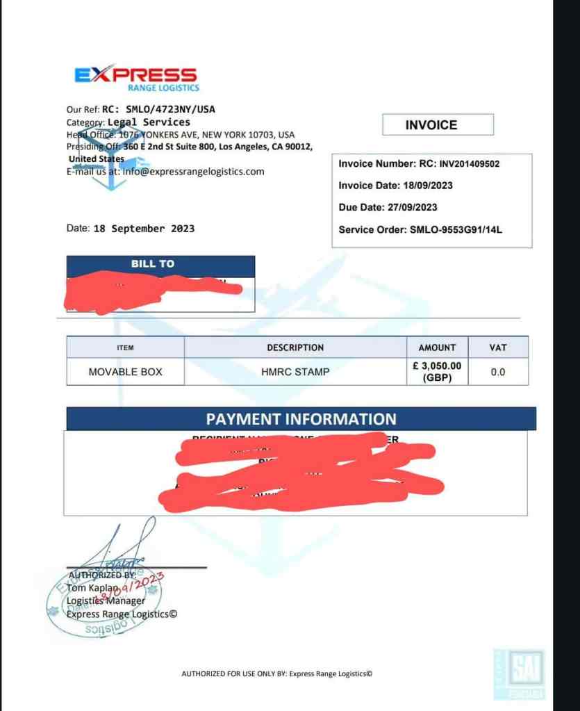 It seemed that everything was ok and according to plan. Tom Kaplan or who ever this courier was, kept me updated on E-mail. But when the box “came to Great Britain” I had to pay for a British stamp and Kaplan was so sorry for the “unforseen development”. They didn’t know about this stamp. The invoice was £ 3050 GBP which I refused to pay, and I asked them to return the box to the US.